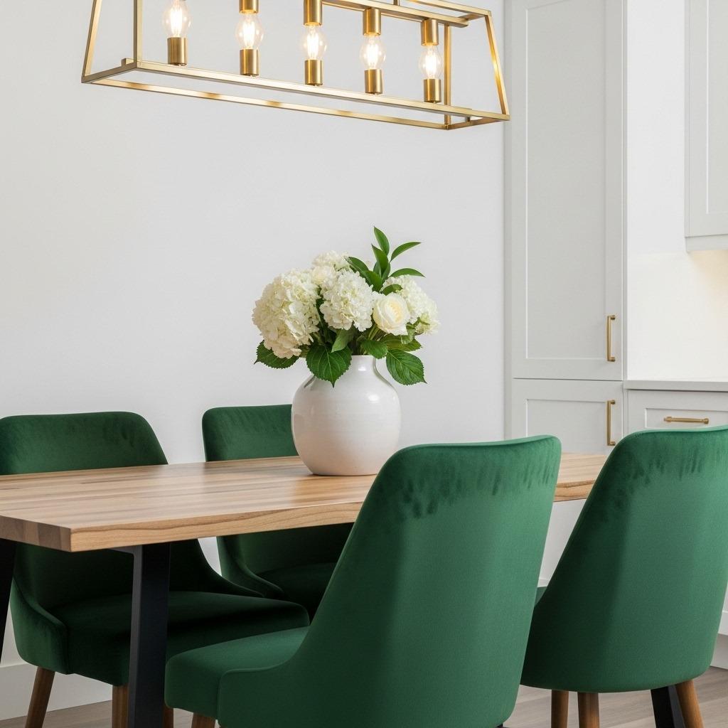 Don’t be afraid to mix green chairs with other colors if you have a larger dining set. Alternating green with natural wood or white creates rhythm and prevents the space from feeling too matchy. This works particularly well in space saving dining room layouts where visual interest matters more than square footage.