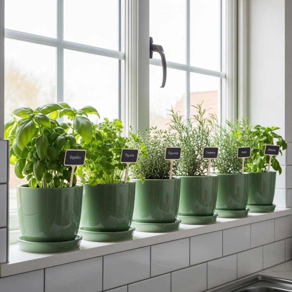 Ceramic planters in different green glazes – from celadon to forest – add personality while keeping things cohesive. You can find these at various price points, and mixing high and low pieces makes the collection feel more personal. Add small labels with herb names for a charming kitchen garden aesthetic.