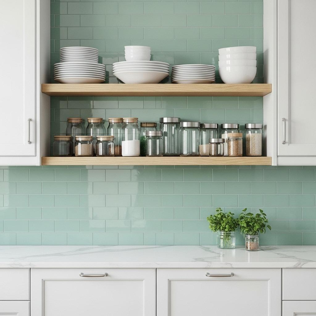 Open shelving painted in a soft green provides both storage and color. Green shelves frame your dishes and glassware beautifully while keeping everything accessible.