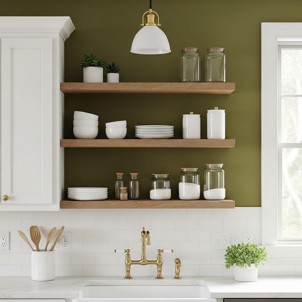 What you display matters as much as the shelves themselves. White ceramics pop against green backgrounds, creating a clean, gallery-like effect. Mix in some natural wood cutting boards, glass jars filled with pantry staples, and maybe a small potted herb or two. The combination feels lived-in and purposeful.