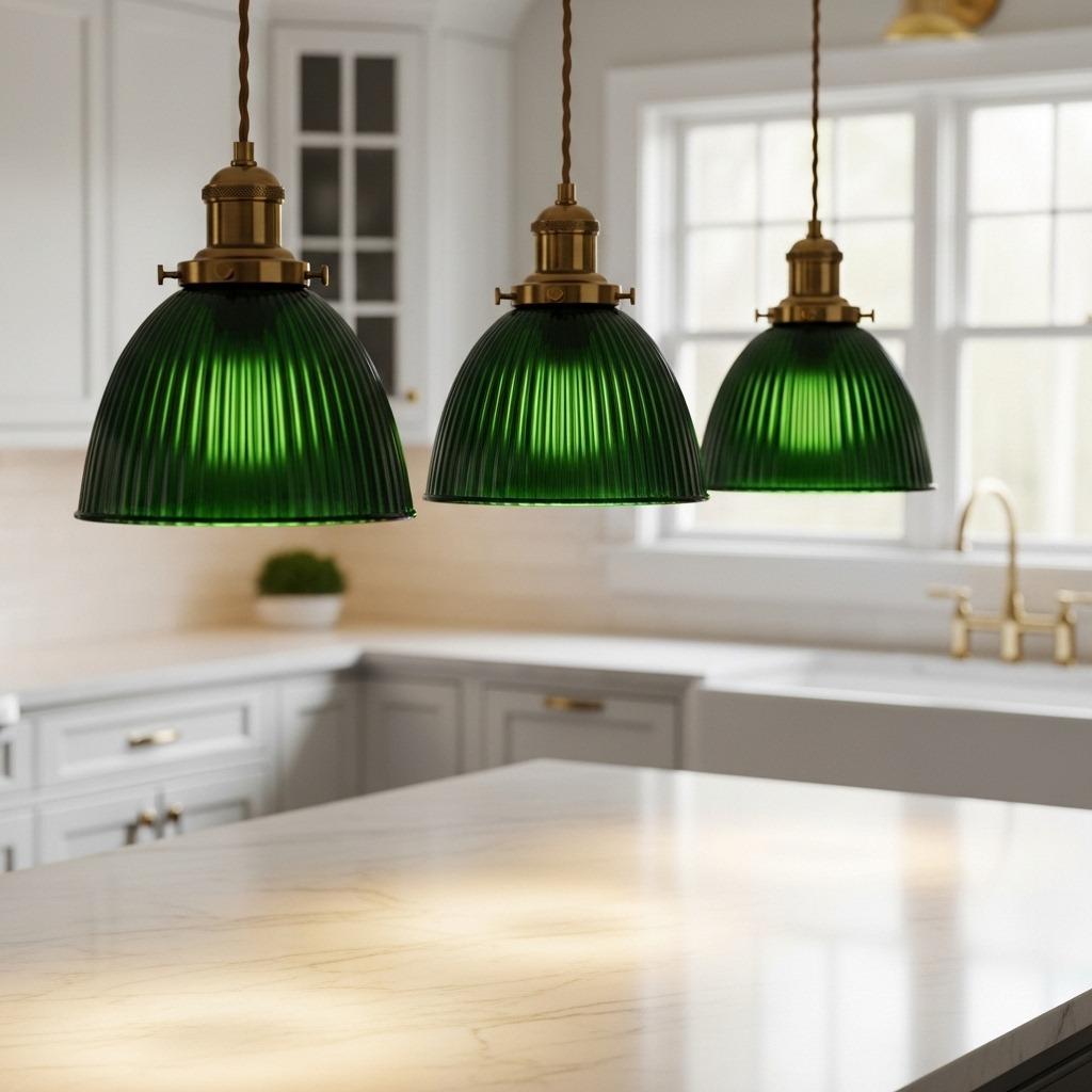 Lighting often gets treated as an afterthought, but green glass pendants add color and ambiance in one go. Vintage-style green glass shades over an island or dining table create pools of warm light that make the space feel intimate and inviting. It’s functional and decorative without taking up any counter space.