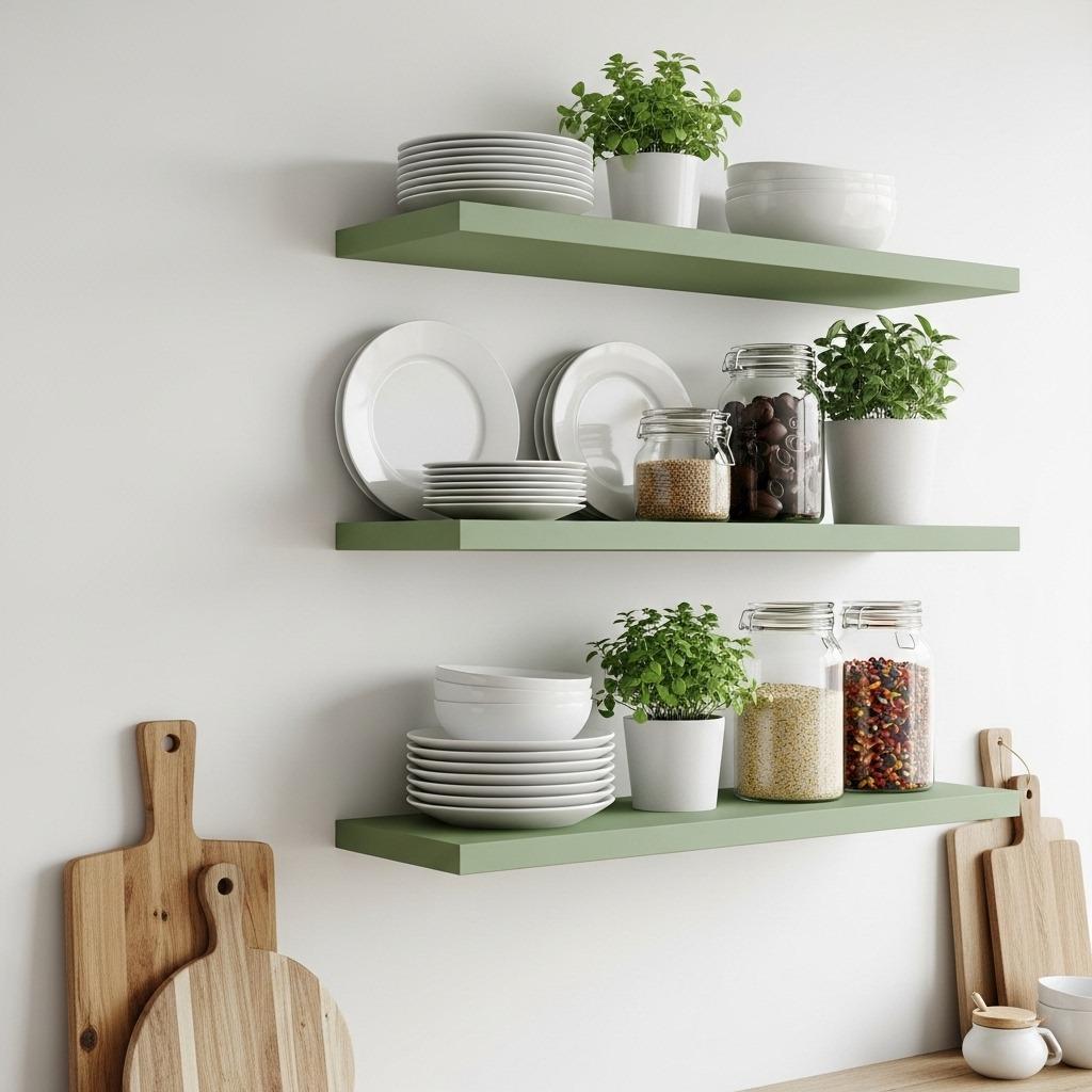 The shade of green affects the overall mood dramatically. Mint green shelves feel playful and light, perfect for cottagecore or coastal styles. Deeper greens lean more traditional and sophisticated. Choose based on how you want your kitchen shelving ideas to complement the rest of your space.