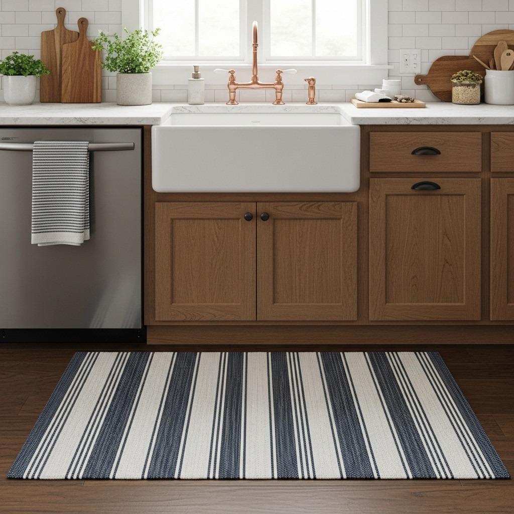 There’s something effortlessly chic about a striped runner stretching along your kitchen workspace. The linear pattern naturally draws the eye through the space, making even compact kitchens feel more expansive. Black and white stripes create crisp contrast, while softer color combinations like navy and cream or gray and white offer a gentler approach.