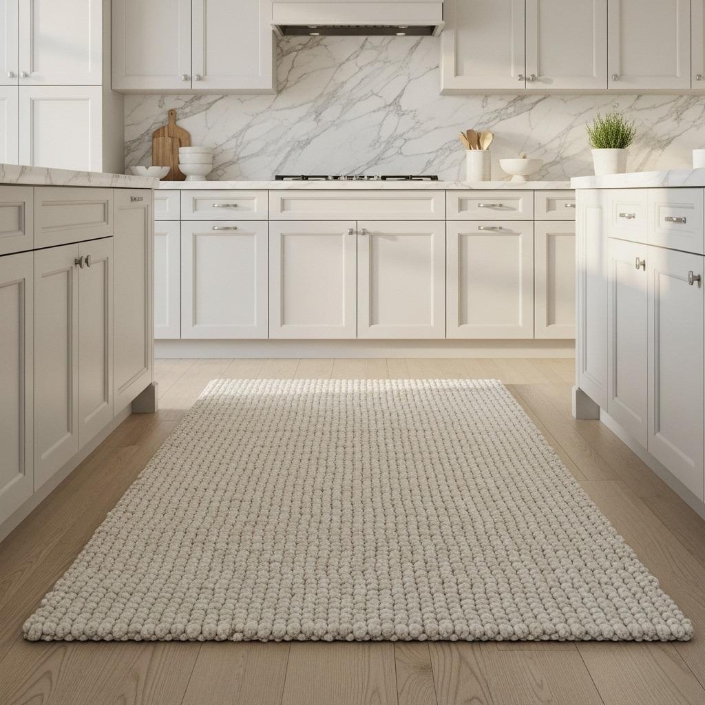 These rugs excel in kitchens with bold backsplashes, colorful cabinets, or striking countertops where you need something to balance rather than add to the visual energy. They’re also perfect in Scandinavian-style spaces that prioritize calm, minimalist aesthetics. The neutral palette creates a foundation that allows everything else to shine.
