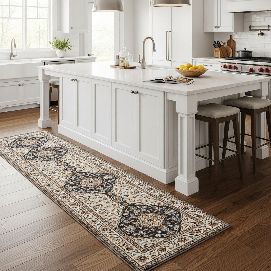 These rugs work surprisingly well in kitchens because their busy patterns naturally camouflage spills and splashes. A rich burgundy or navy base with cream and rust accents can anchor your entire color scheme. They’re especially stunning in kitchens with vintage kitchen decor elements or as a contrast piece in ultra-modern spaces.