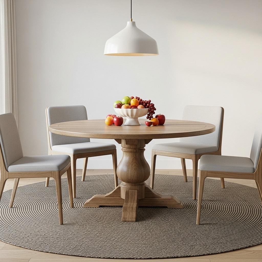 Size is crucial with round rugs – you want enough diameter that chairs remain on the rug even when pulled out. Generally, add at least 24 inches to your table diameter to ensure comfortable seating. This creates a distinct room-within-a-room effect that separates your eating zone from your cooking zone in open floor plan kitchens.