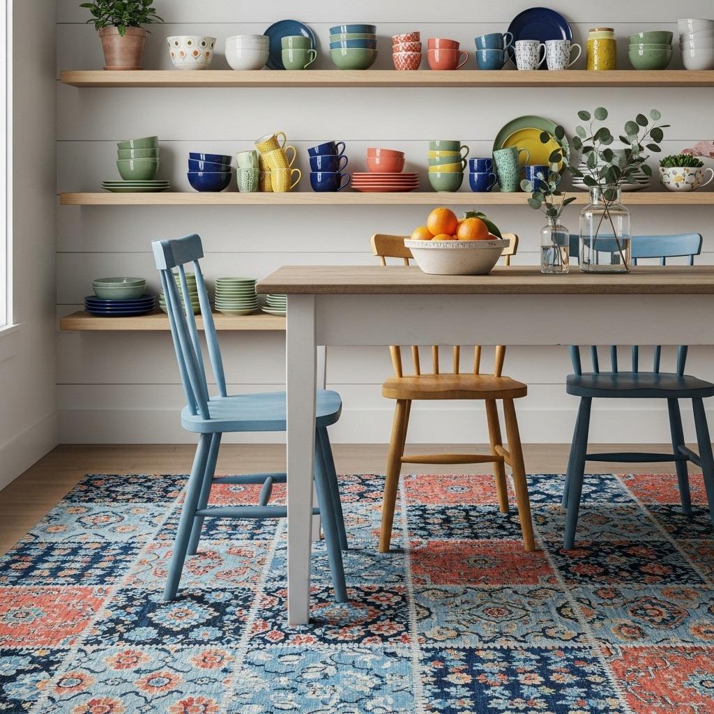 Patchwork works beautifully in kitchens that embrace color and pattern elsewhere – think colorful dishes on open shelving, patterned backsplashes, or collected vintage accessories. The rug becomes part of that layered, personal aesthetic.