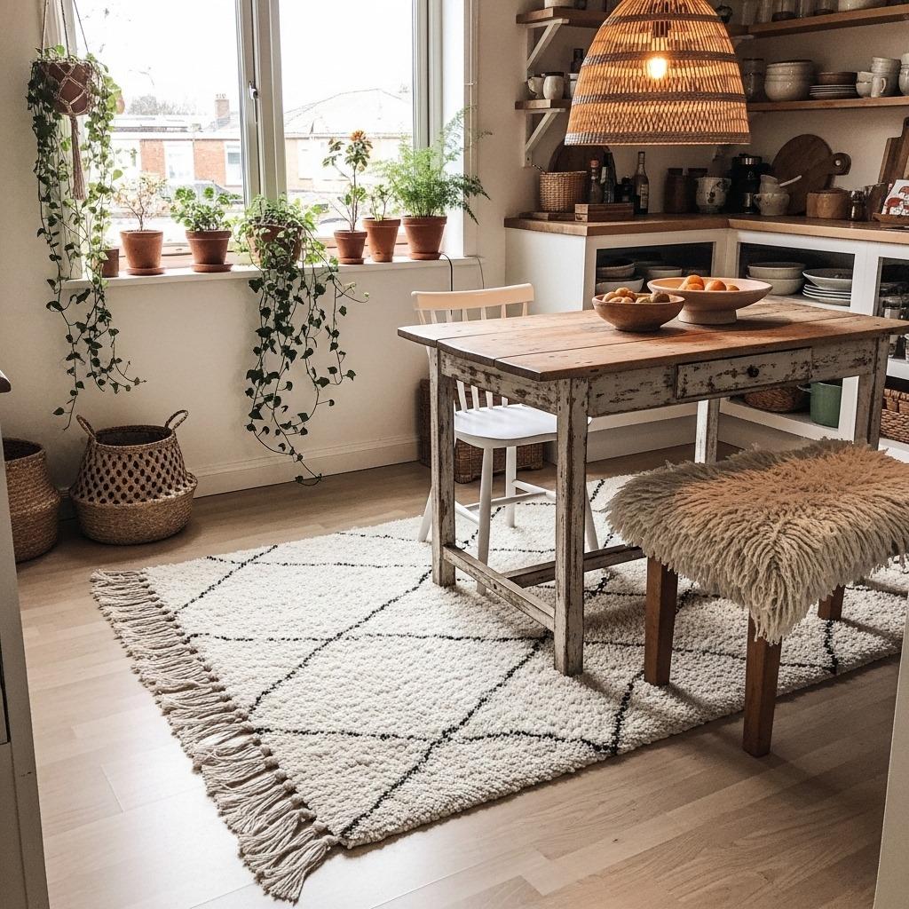 Rugs with fringe details add movement and textural interest that feels relaxed and slightly undone. Whether it’s short fringe on the ends of a runner or longer dramatic fringe on a larger area rug, these details soften the hard edges typical in kitchen spaces. The boho aesthetic brings warmth and personality without being overly formal.