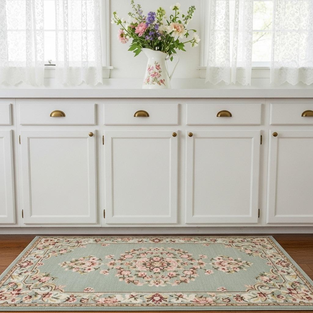 These rugs work beautifully in kitchens with vintage charm, cottage aesthetics, or spaces where you want to introduce organic shapes into an angular environment. The botanical element connects your indoor kitchen to garden inspiration. Paired with simple white cabinets and natural wood tones, a floral rug becomes the personality element that makes the space feel complete.