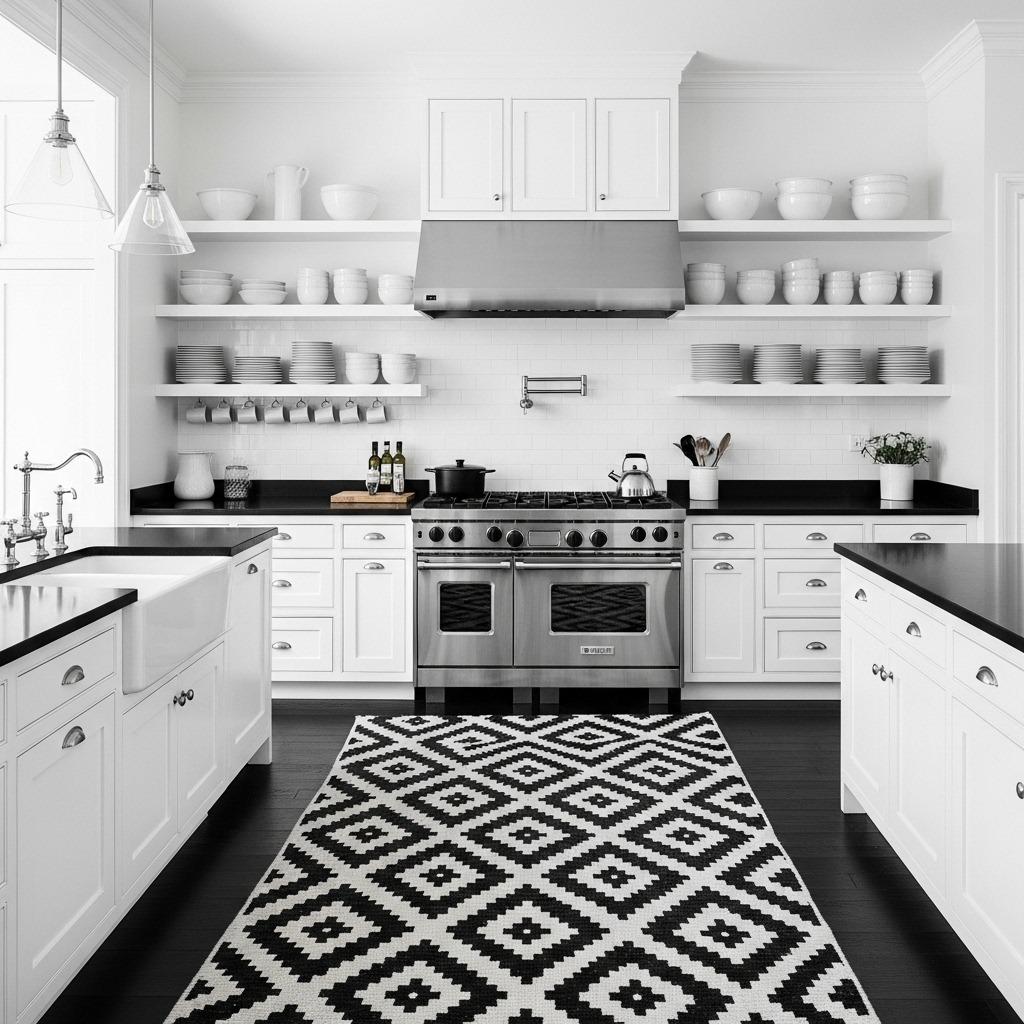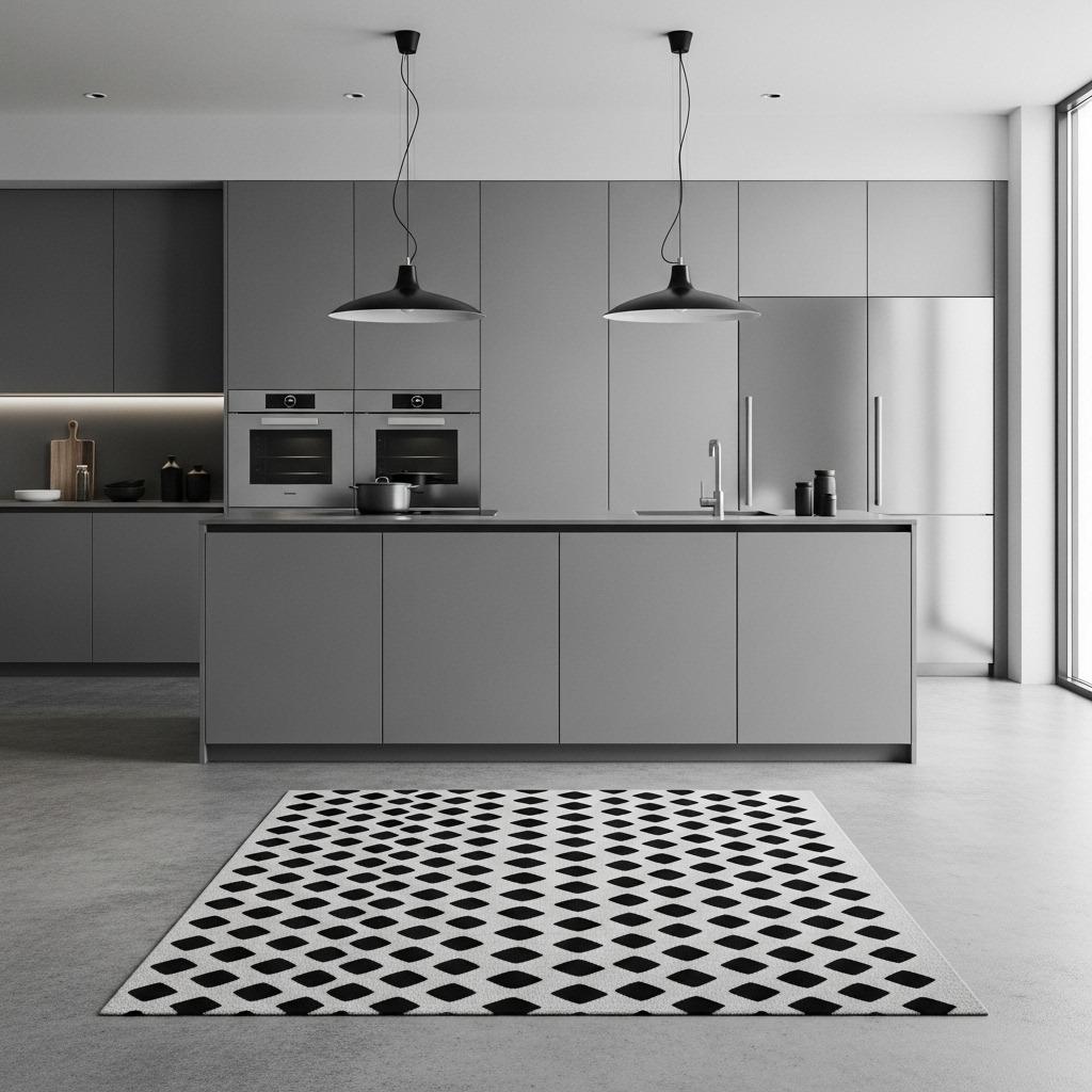 Sometimes you need a rug that makes a statement. Black and white graphic designs – whether Moroccan-inspired diamonds, bold stripes, or abstract patterns – create instant drama. The high contrast demands attention and can actually make small kitchens feel more intentional and designed.