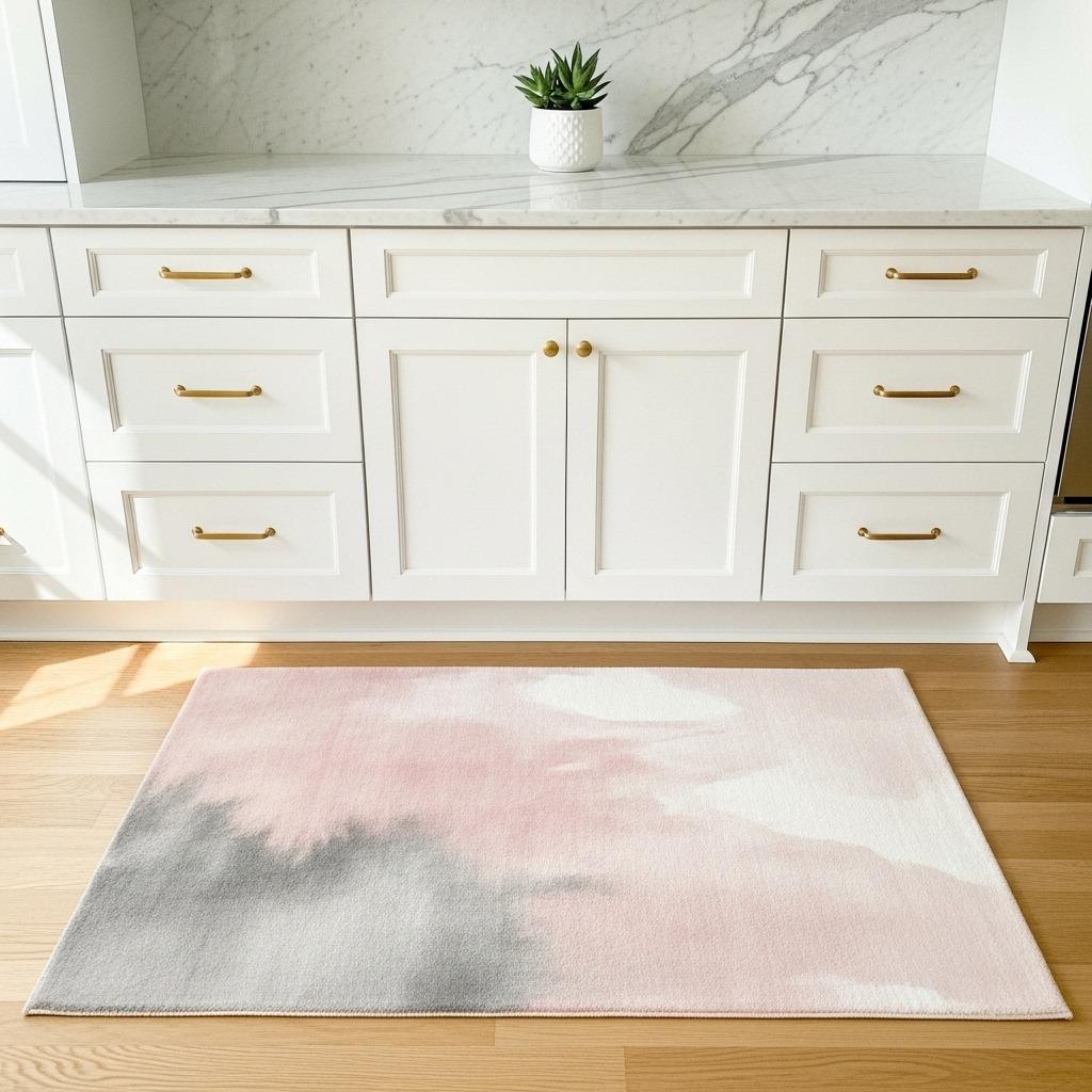 Watercolor-style rugs bring a dreamy, artistic quality to kitchen floors. These designs feature soft color transitions and abstract patterns that resemble painted canvas. Blush pinks melting into soft grays, ocean blues fading to seafoam green, or sunset oranges bleeding into cream create movement without harsh lines.