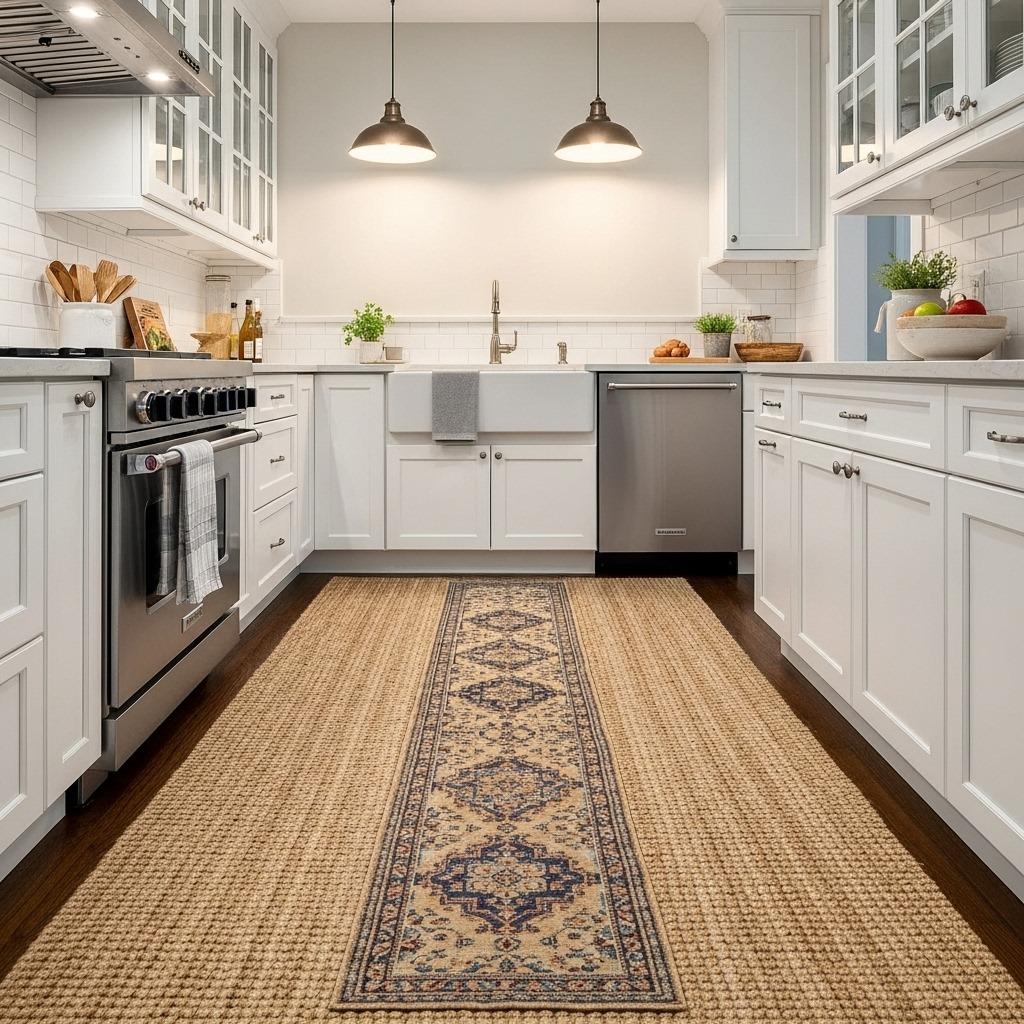 Jute rugs bring that earthy, relaxed feel that softens even the most utilitarian kitchen. The natural fiber texture adds warmth underfoot and creates beautiful contrast against smooth surfaces like tile, concrete, or hardwood. The neutral tan color works as a grounding element that lets your cabinets, backsplash, and accessories take center stage.