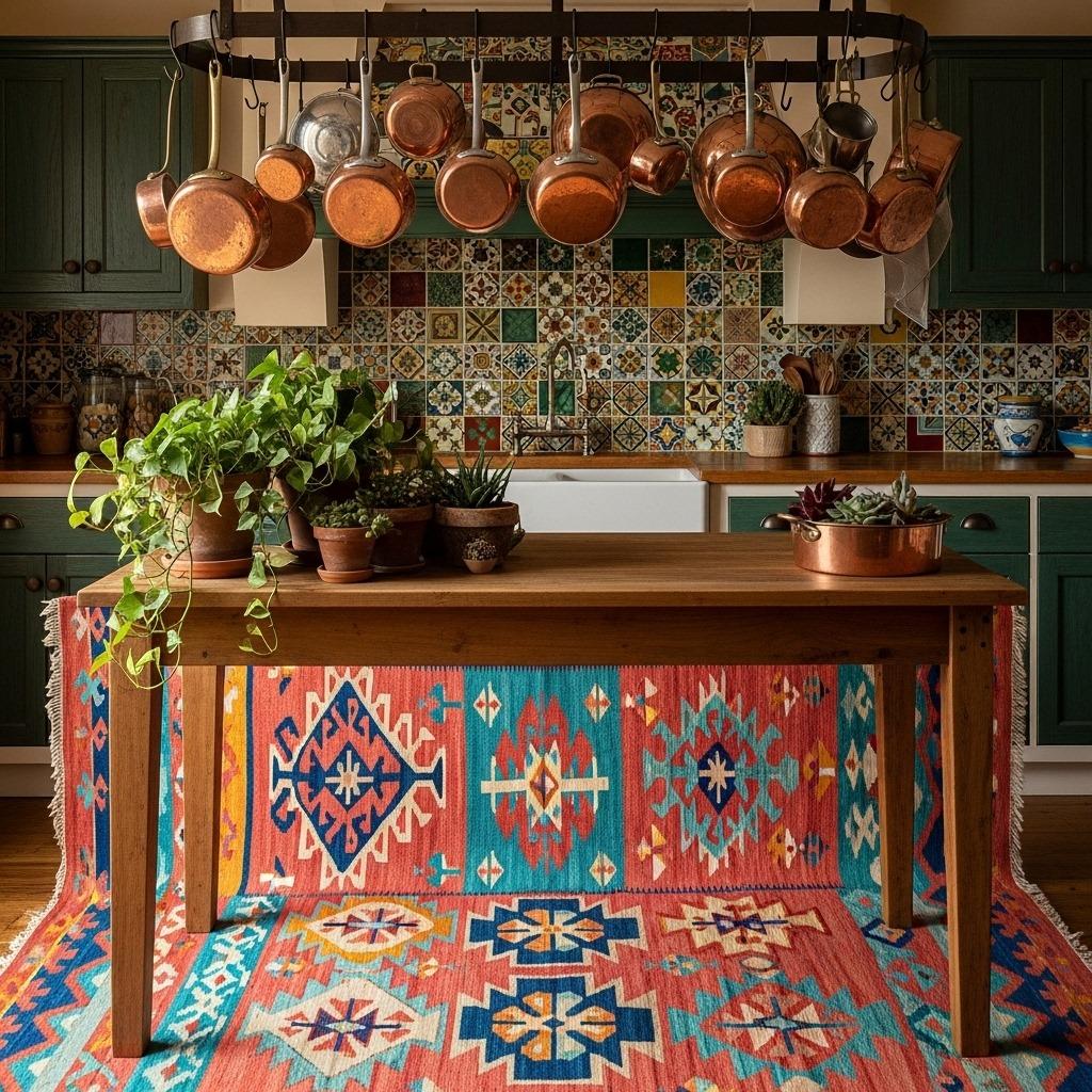 Kilim rugs bring that well-traveled, worldly aesthetic to kitchen spaces. These flat-woven textiles feature geometric patterns and vibrant color combinations – think coral, turquoise, ochre, and magenta dancing together. The relatively thin profile makes them practical for kitchens while the bold patterns inject serious personality.