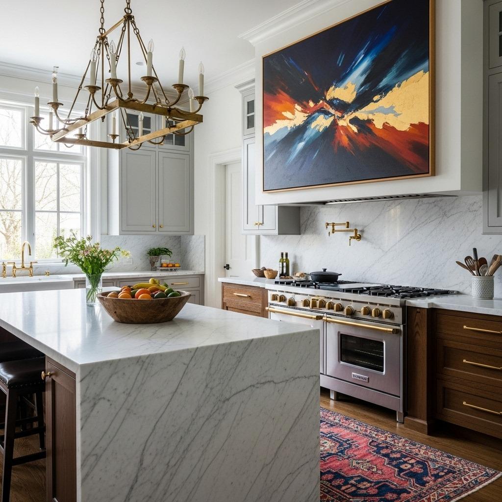 Art in kitchens remains underutilized. A large-scale piece above your range or on a prominent wall immediately signals this is a designed space, not just a utilitarian room. Choose pieces that can handle humidity and temperature changes, and consider whether the subject matter feels appropriate for a cooking space.
