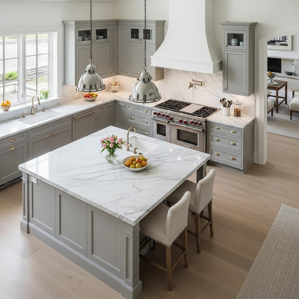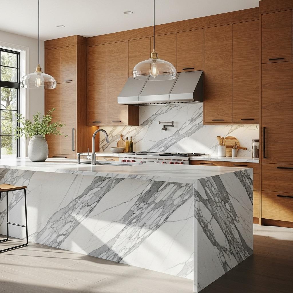 Waterfall edges on islands have become signature elements in upscale kitchen style. The stone cascades down the sides, creating a sculptural focal point that demands attention. Yes, it requires more material and skilled installation, but the visual payoff transforms an ordinary island into furniture-quality craftsmanship.