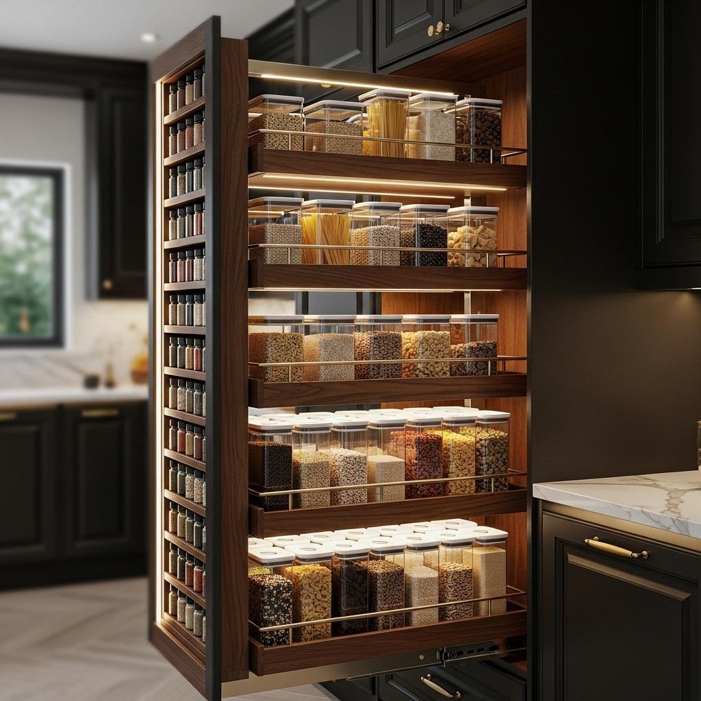 Pantry organization reaches new heights in upscale kitchen style. Whether you have a walk-in or a tall cabinet system, custom shelving that’s actually designed for how you shop and cook makes a huge difference. Adjustable shelves, pull-out baskets, and integrated lighting transform storage from merely functional to genuinely pleasant to use.