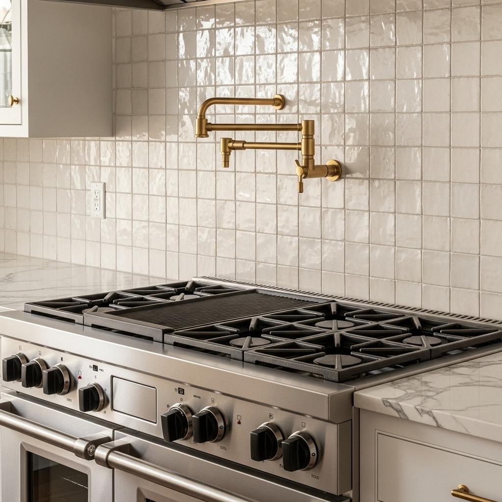 Unlacquered brass that develops a natural patina over time brings warmth and authenticity. Matte black keeps things modern and sophisticated. Polished nickel offers timeless elegance. The key is consistency throughout – cabinet pulls, drawer handles, faucets, light fixtures, even pot fillers should share a finish family.