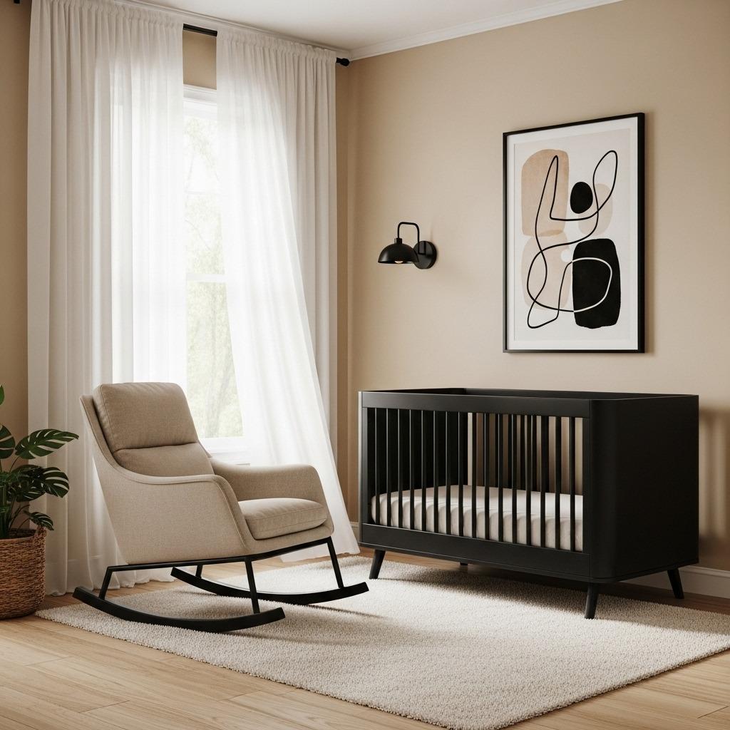 Before you dismiss beige as boring, hear me out. Modern beige is having a major moment, and when paired with strategic black accents, it creates one of the chicest contemporary baby room designs possible. This is minimalist nursery design at its finest.