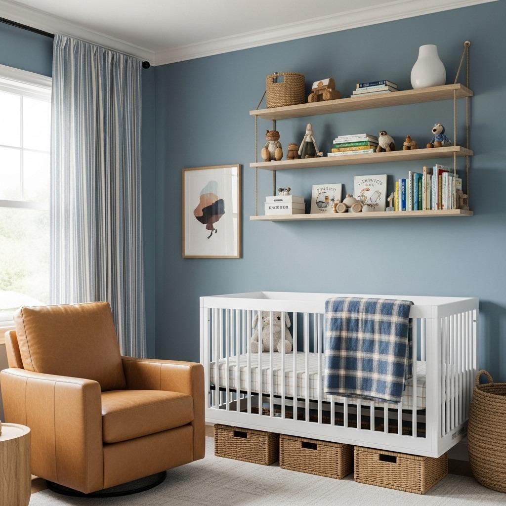 Dusty blue has become a nursery favorite because it reads as both calming and sophisticated. Pair it with warm tan tones, and you’ve got a combination that feels grounded and serene. This palette works beautifully for any gender and ages gracefully.
