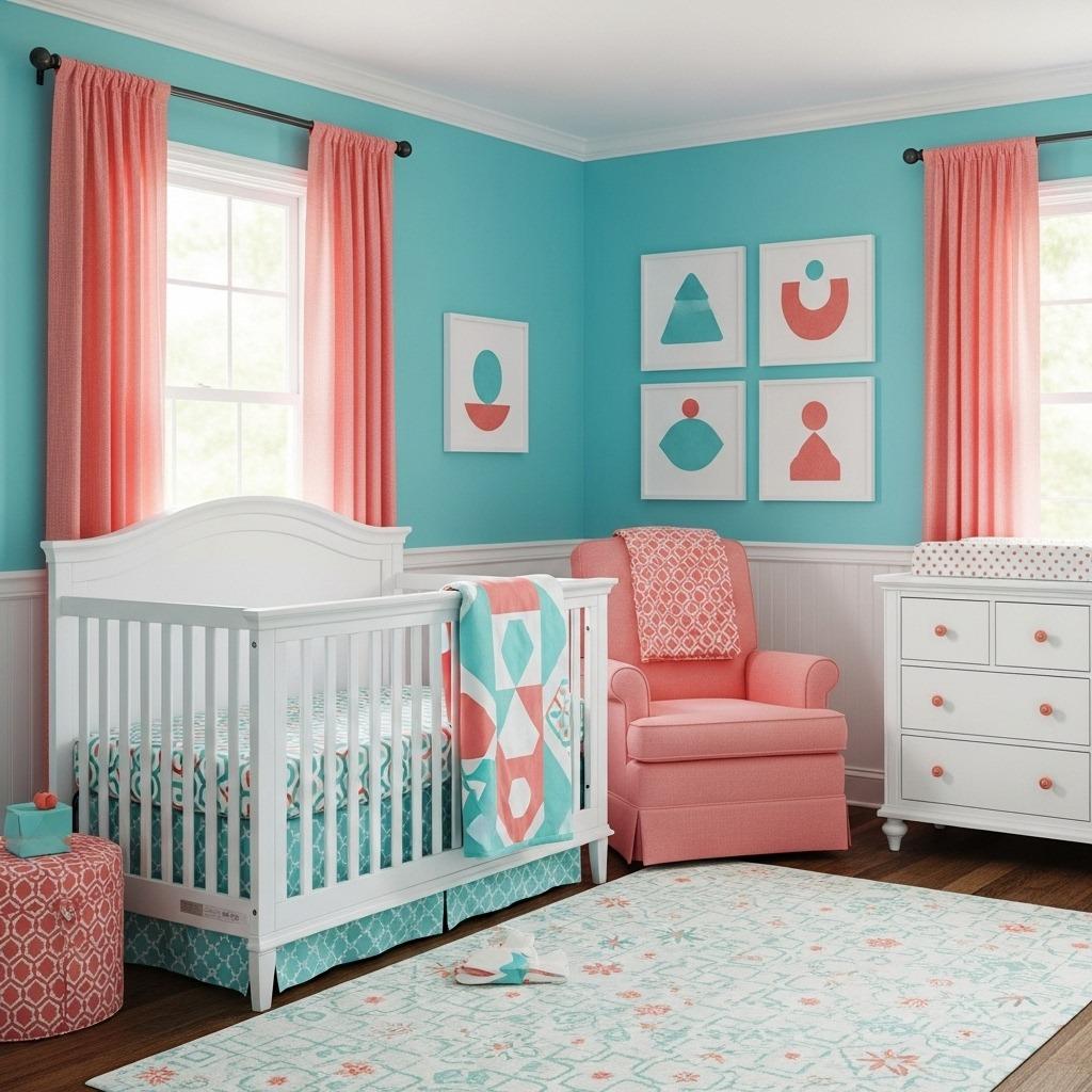 This vibrant pairing brings serious energy while still maintaining that modern sensibility. Coral and aqua together feel beachy and fun without requiring a full nautical theme. The combination is playful enough for a baby while still looking grown-up and intentional.