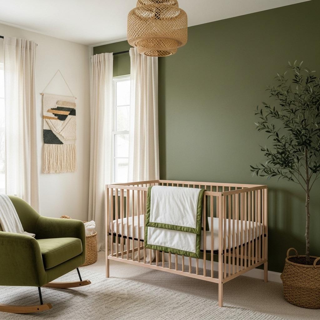 Olive green might seem like an unusual choice, but it creates one of the most calming, nature-inspired nurseries imaginable. When paired with soft cream, the combination feels earthy and warm. It’s perfect for parents who want something truly different from typical nursery colors.