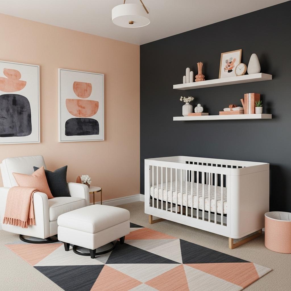 Try using peach on three walls and charcoal on one accent wall behind the crib. This creates a focal point without overwhelming the space with dark color. Alternatively, charcoal walls with peach accents work if you have excellent natural light and want something more dramatic.