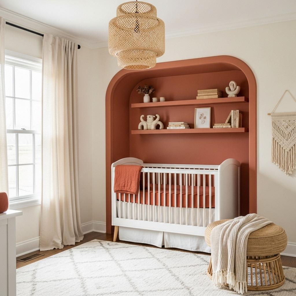 The beauty of this palette is its versatility. You can use terracotta as an modern accent wall ideas behind the crib, or incorporate it through textiles, artwork, and accessories. Cream walls keep everything feeling bright and open, while terracotta accents add warmth and personality.