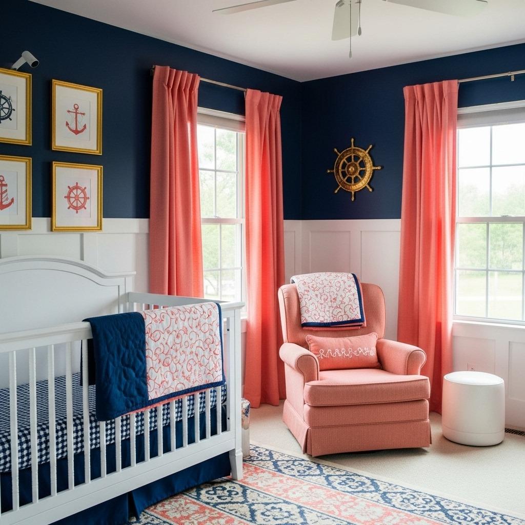 Navy blue has replaced bright primary blue in contemporary baby room design, and for good reason. It feels more sophisticated and calming while still bringing that classic appeal parents love. When you add coral as an accent, you get warmth and playfulness without going overboard.