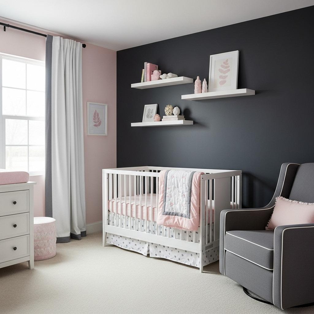 Try painting three walls in charcoal and leaving one wall in soft pink, or vice versa depending on your room’s natural light. Add plenty of white elements like the crib, dresser, and curtains to break up the darker tones. This approach creates visual interest without requiring complicated design skills, much like the principles used in monochromatic bedroom ideas.