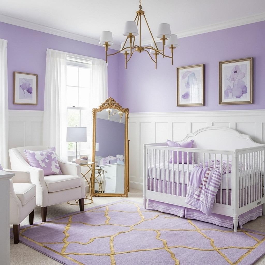 Lavender brings a sense of calm that’s hard to beat in a nursery setting. When you pair it with gold accents, you elevate the entire space into something truly special. This combination feels royal without being fussy, modern without being cold.
