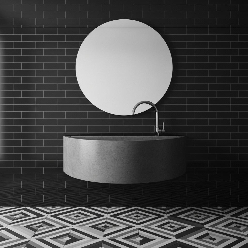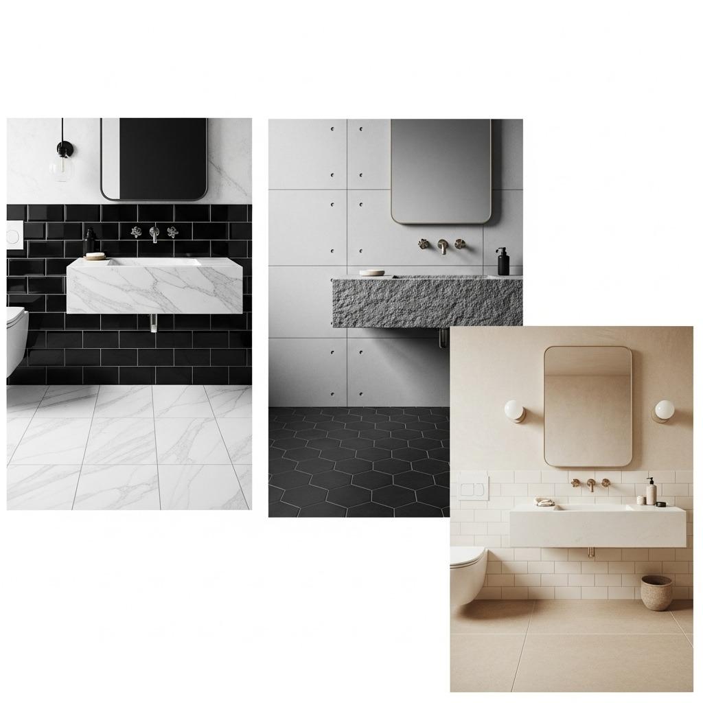 When you remove color as a variable, shapes become much more noticeable. Round mirrors soften angular tile work. Rectangular fixtures provide structure against curved vanities. Geometric patterns introduce visual rhythm.