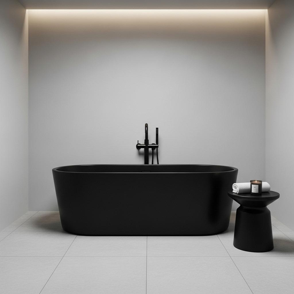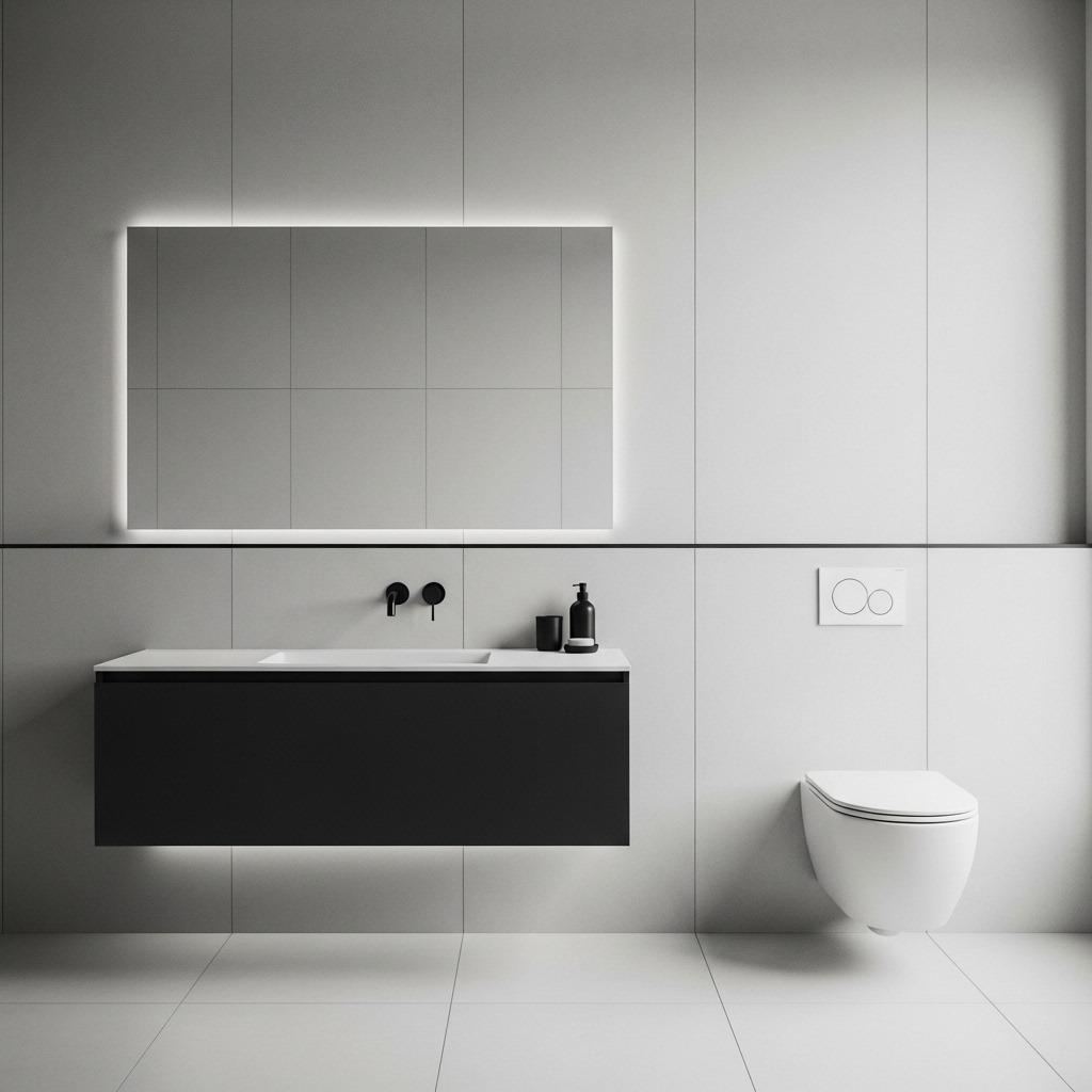 In a monochrome bathroom, distribute visual weight so the space feels balanced. If your floor is very dark, balance it with some darker elements on upper walls or ceiling. An all-white room with a single black vanity will feel bottom-heavy and off-kilter.