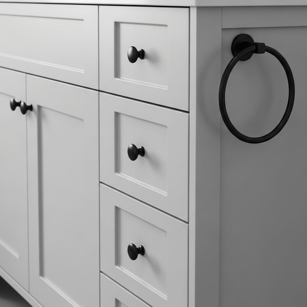 Matte black hardware has become incredibly popular in modern monochrome bathrooms, and for good reason. It anchors lighter color schemes and reads as sophisticated rather than trendy. Brushed nickel or chrome works beautifully in cooler-toned grey schemes, catching light and adding subtle shine.