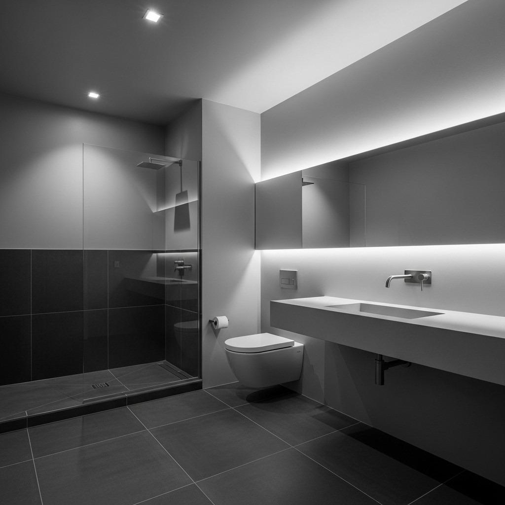 Don’t distribute contrast evenly throughout the room. Cluster your highest-contrast elements in areas you want to emphasize, like around mirrors or in the shower. Let other areas rest at medium contrast levels. This creates visual hierarchy and guides movement through the space.