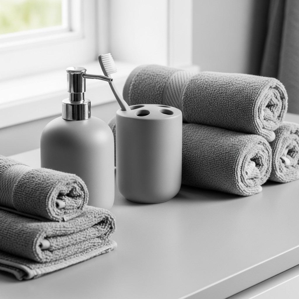 Choose towels, bath mats, soap dispensers, and storage containers that align with your palette. White towels in a grey bathroom, black accessories in a black and white scheme, tonal variations in an all-grey space. Quality matters here because there’s nowhere for mediocre items to hide.
