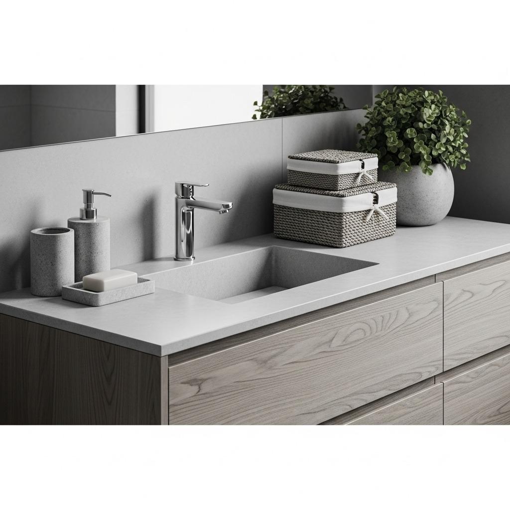 A wooden vanity in natural finish or stained to match your palette brings warmth. Woven baskets in grey or cream provide textured storage. Stone vessels or accessories ground the space. Even if these elements are neutral rather than strictly monochromatic, they enhance rather than disrupt your spa-inspired bathroom aesthetic.