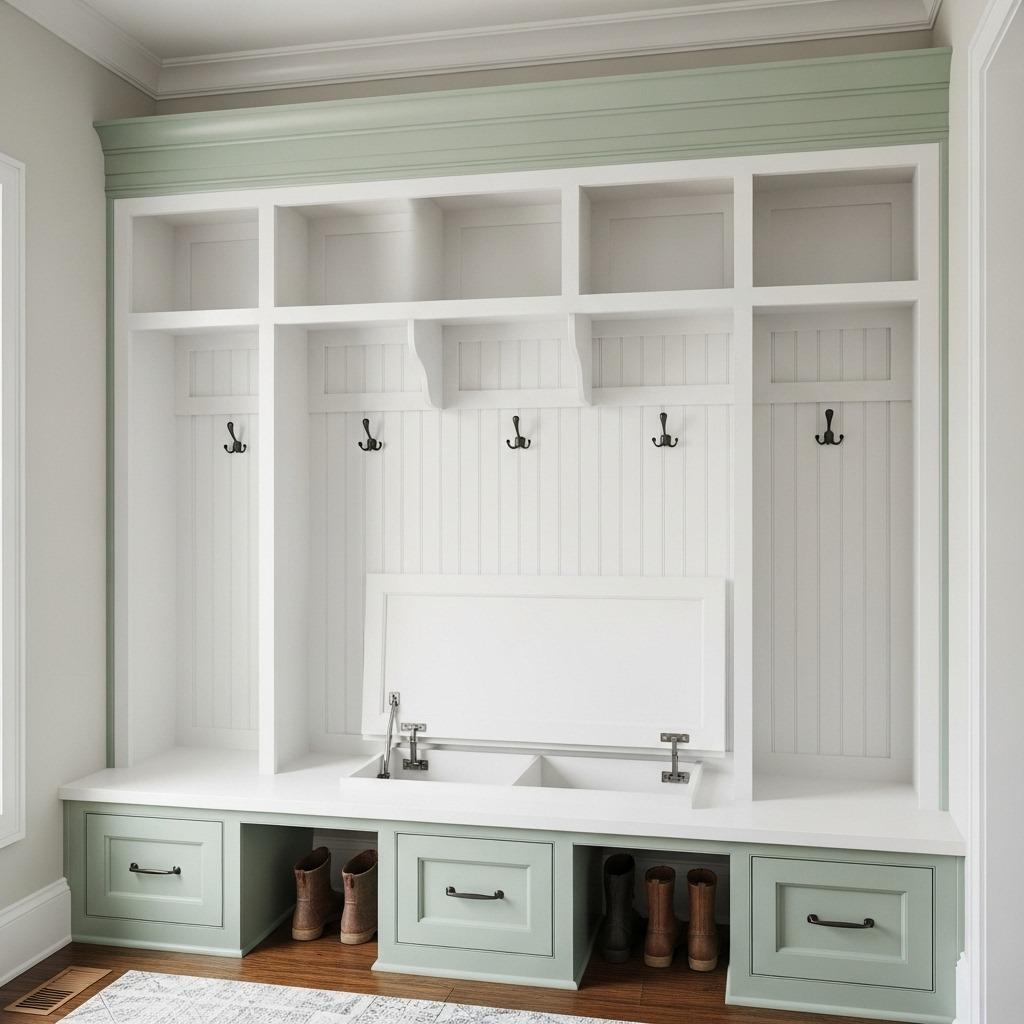 Install a pull-out hamper system in the lower section of your mudroom cabinetry. Some designs include multiple hampers for sorting lights and darks right from the start. This small addition streamlines laundry day and prevents dirty clothes from migrating throughout the house.