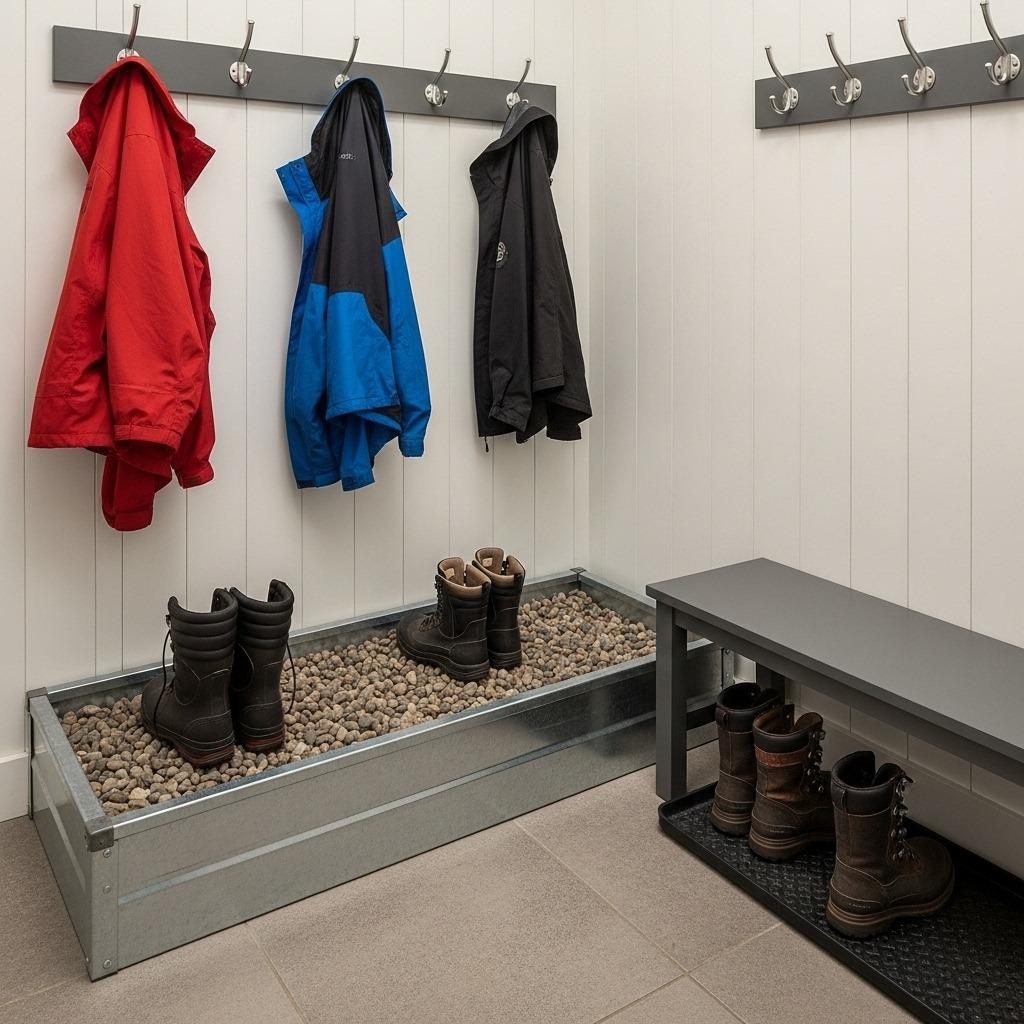 Wet boots and coats need special consideration in mudroom planning. A dedicated drying station with proper drainage prevents water damage and keeps moisture contained.