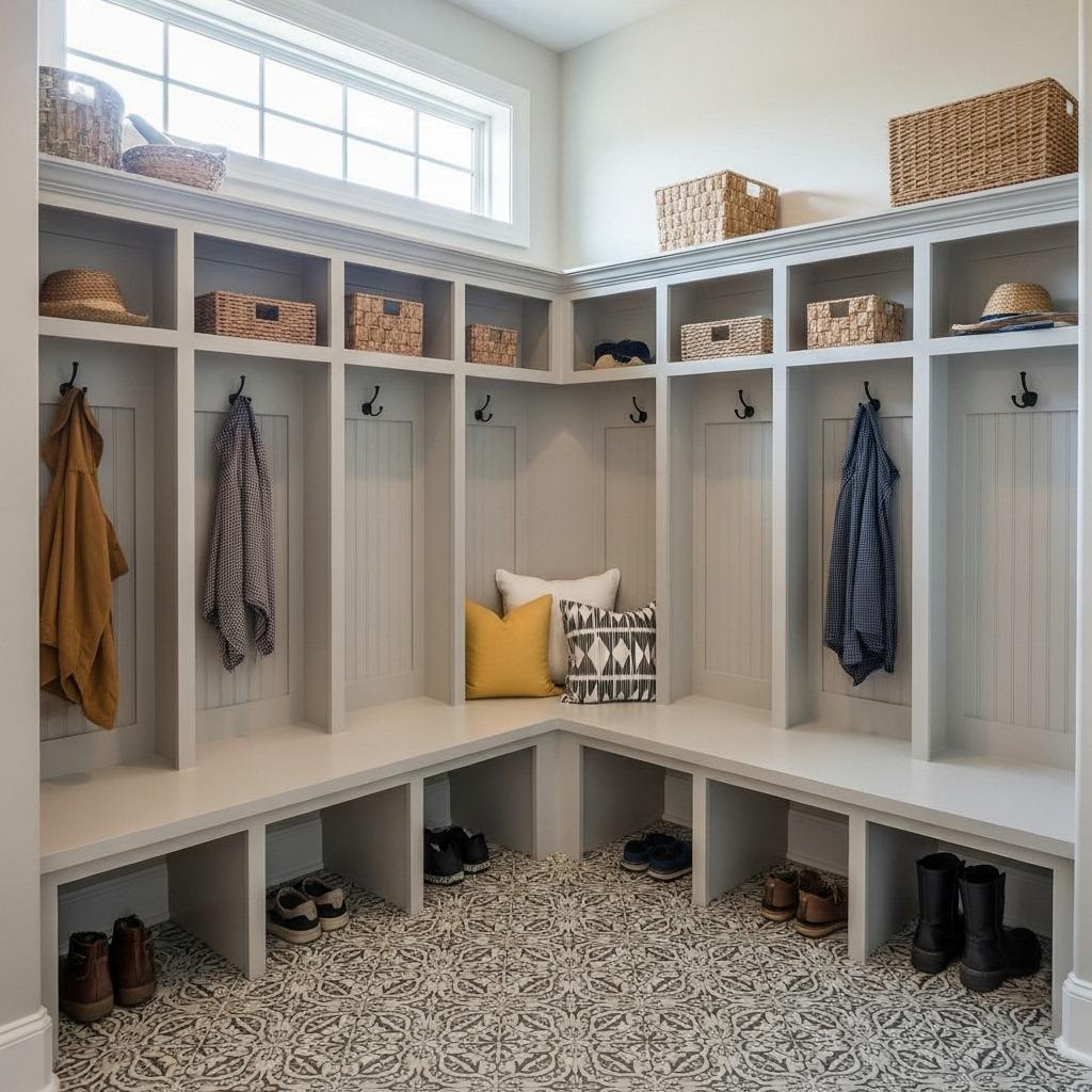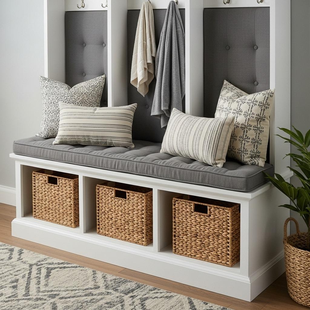 Add a wipeable cushion in a durable fabric that can handle daily wear. Coordinate throw pillows can make the space feel more designed rather than purely functional. This approach works especially well if your mudroom doubles as a transitional space that’s visible from other rooms.