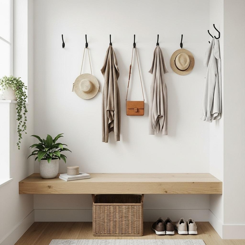 Stick to a neutral color palette – whites, light woods, and soft grays. Choose just a few high-quality storage pieces rather than filling every wall. A floating bench, a row of simple hooks, and one or two baskets might be all you need if you regularly edit what stays in the mudroom.
