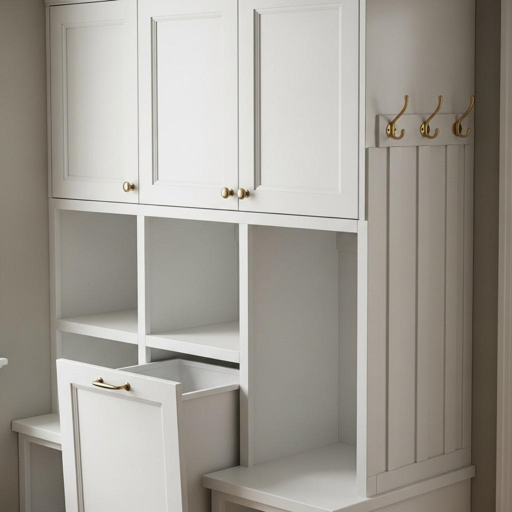 Integrating a laundry hamper into your mudroom design is surprisingly practical, especially for active families. Kids can shed dirty sports uniforms immediately, and the hamper stays hidden behind cabinet doors.