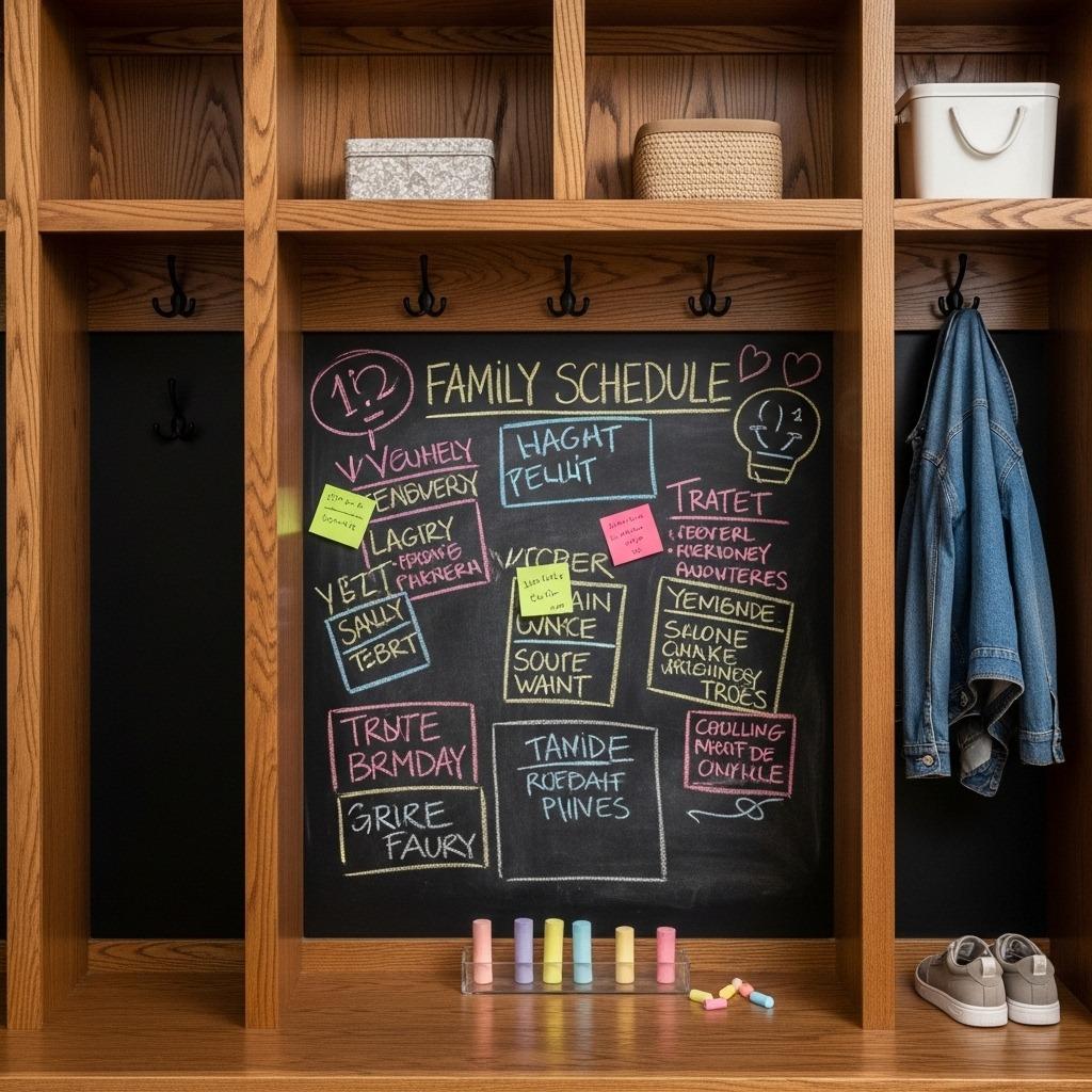 A chalkboard wall transforms your mudroom into a family communication center. Write reminders, weekly schedules, motivational messages, or let kids doodle while waiting to head out the door.