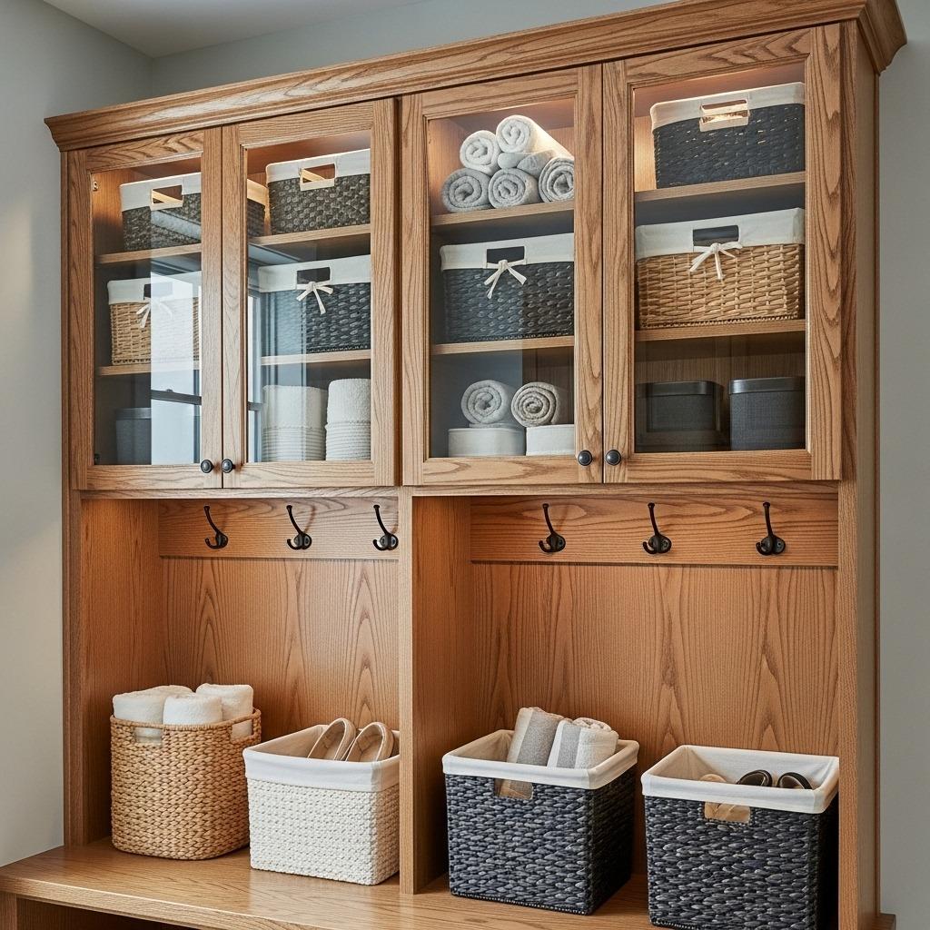 Store attractive baskets, neatly folded items, or seasonal decorations behind the glass. The visibility encourages you to keep things tidy since everything is on display. Add small LED lights inside the cabinets to highlight the contents and improve functionality during darker months.