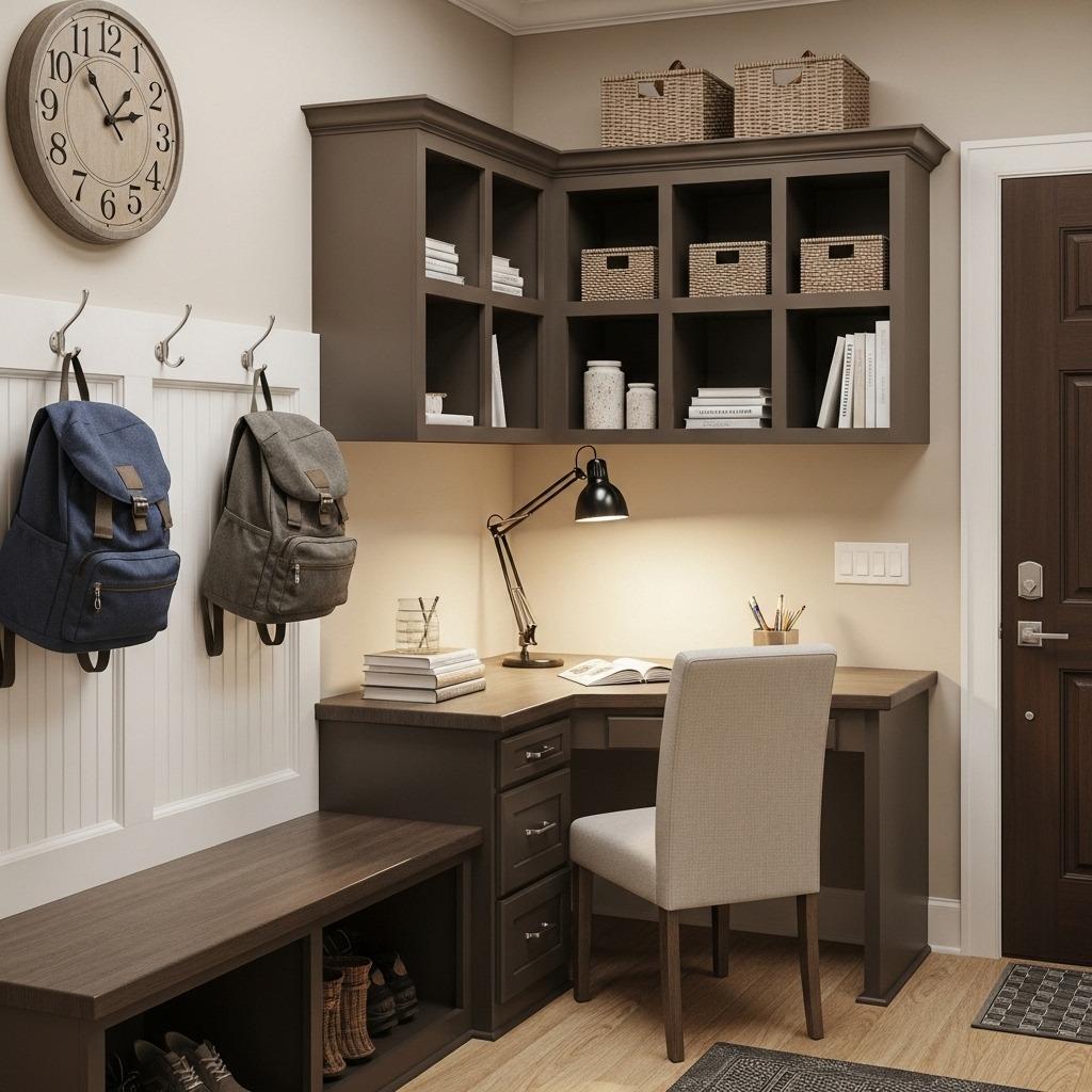 Install a narrow desk or fold-down work surface in one section of your mudroom. Add task lighting and a few shelves for school supplies. This setup is perfect for kids to drop their bags and tackle homework immediately after school, keeping school stuff contained rather than spreading throughout the house.