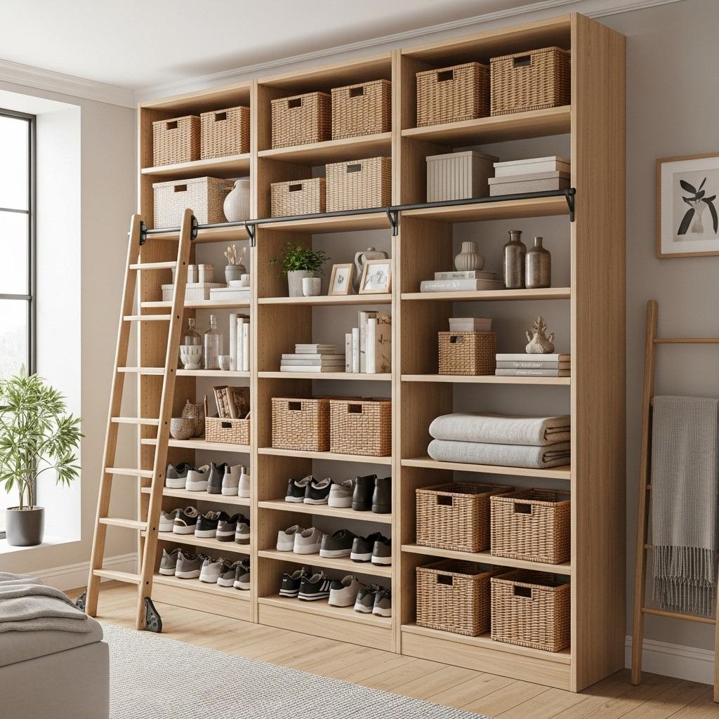 Mix in decorative elements on some shelves to keep the space from feeling too utilitarian. A few plants, attractive storage boxes, or even framed photos can soften the look while maintaining functionality.