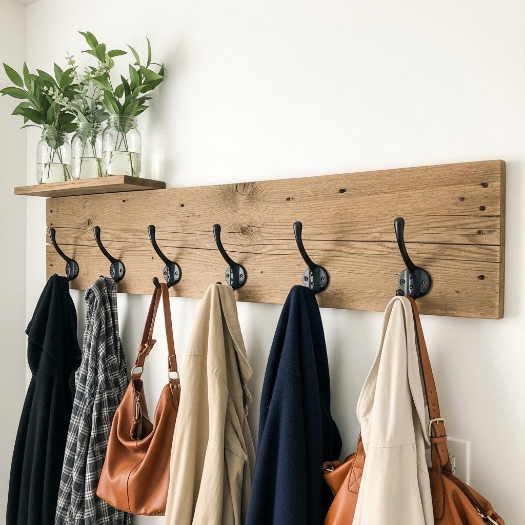 5. Farmhouse-Style Hooks with Reclaimed Wood Board