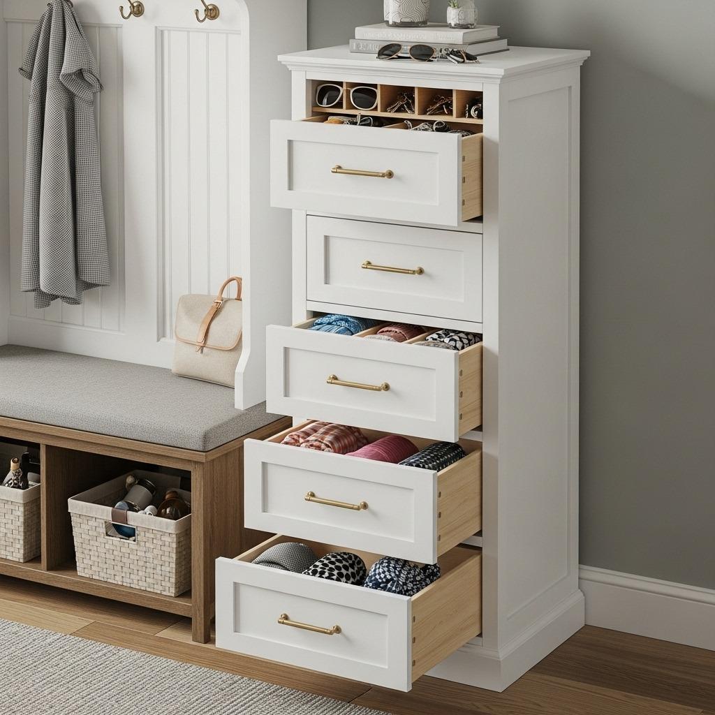 Those small items – dog leashes, sunglasses, spare change, lip balm – always seem to vanish in mudrooms. A dedicated drawer tower keeps these essentials organized and easy to locate when you’re rushing out the door.