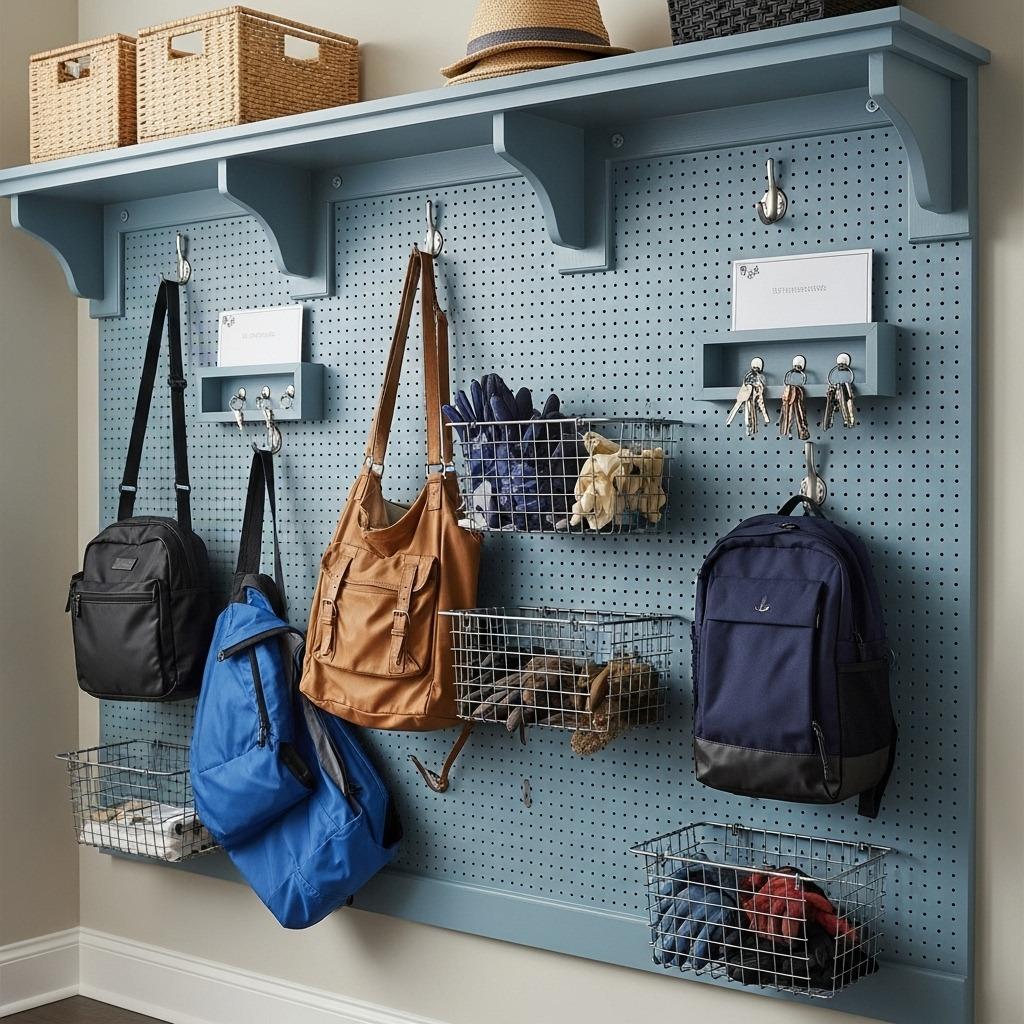 Pegboard isn’t just for garages anymore. A painted pegboard wall in your mudroom creates an infinitely customizable storage system that adapts as your needs change.