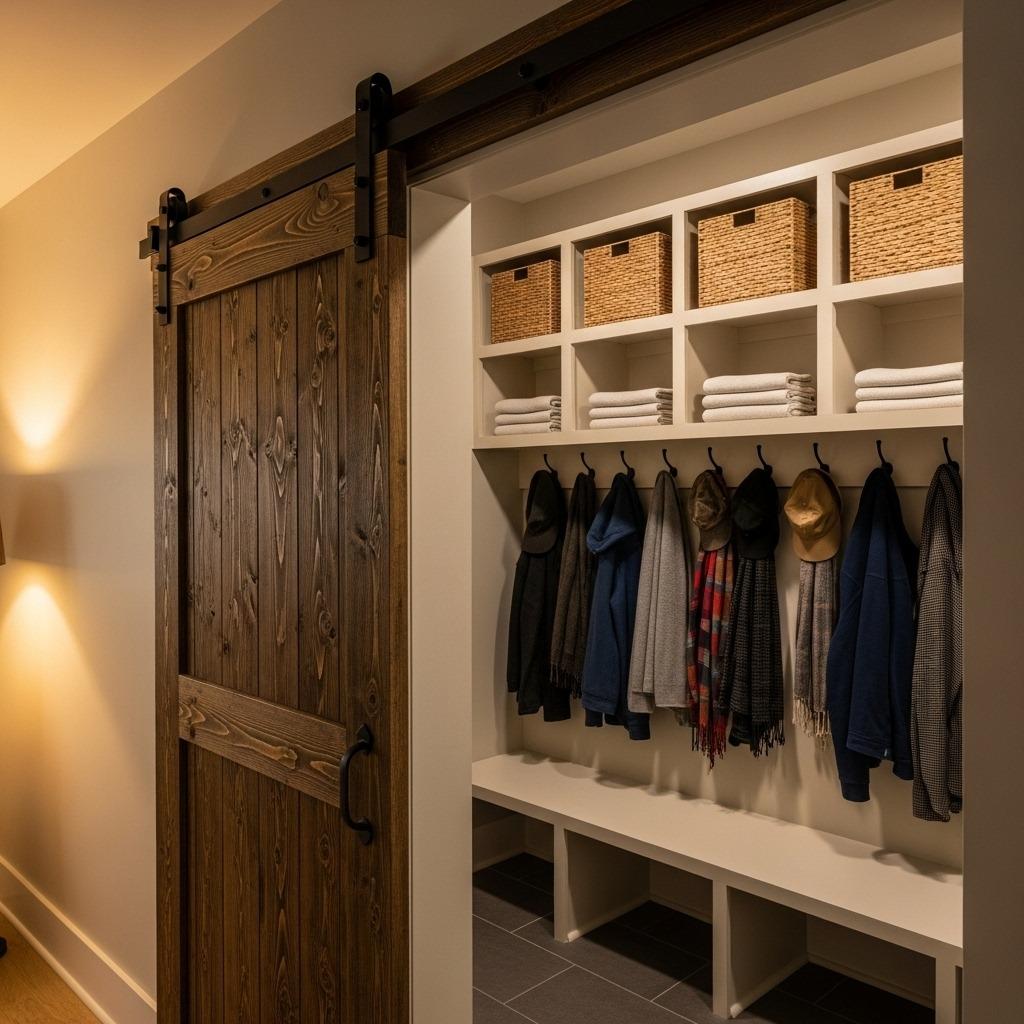 Choose a door style that matches your home’s aesthetic – whether that’s rustic wood, sleek modern panels, or even a chalkboard-painted surface. The sliding mechanism saves space compared to traditional swinging doors, which is particularly valuable in compact mudrooms.