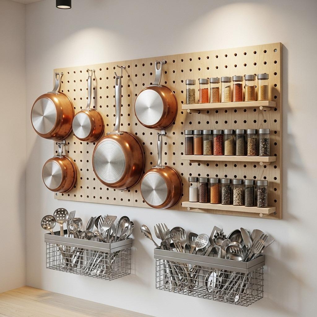 Pegboards aren’t just for garages anymore. Kitchen-specific versions offer sophisticated storage that changes as your needs change. Unlike fixed shelving or hooks, pegboard systems let you move every element whenever you want. Cooked pasta three nights this week? Move your colander and pot to the most accessible positions.